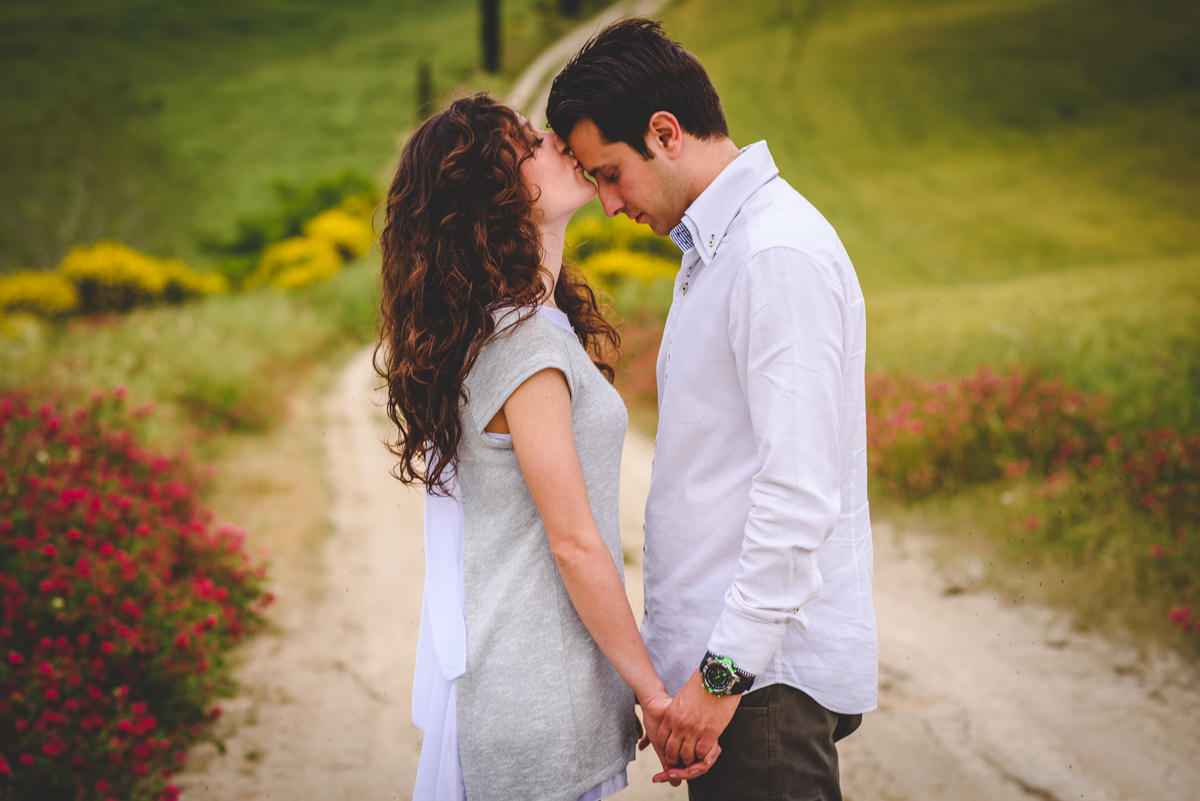 Val d’Orcia is one of the most spectacular places in the world. Have you ever thought about an engagement photography in Val d’Orcia? Enchanting hills, with green meadows, wheat fields, and centenarian cypresses. Everything looks like a painting that comes alive instantly. For the pre-wedding photo service of Chezia and Enzo, I decided to bring the future spouses here and to portray an engagement in Val d’Orcia.